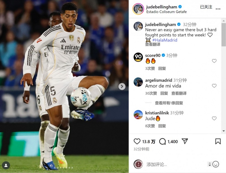 10月20日讯 西甲第9轮赛事 ,贝林厄姆杆位出战,皇马客场应战 1-0击败赫塔费。