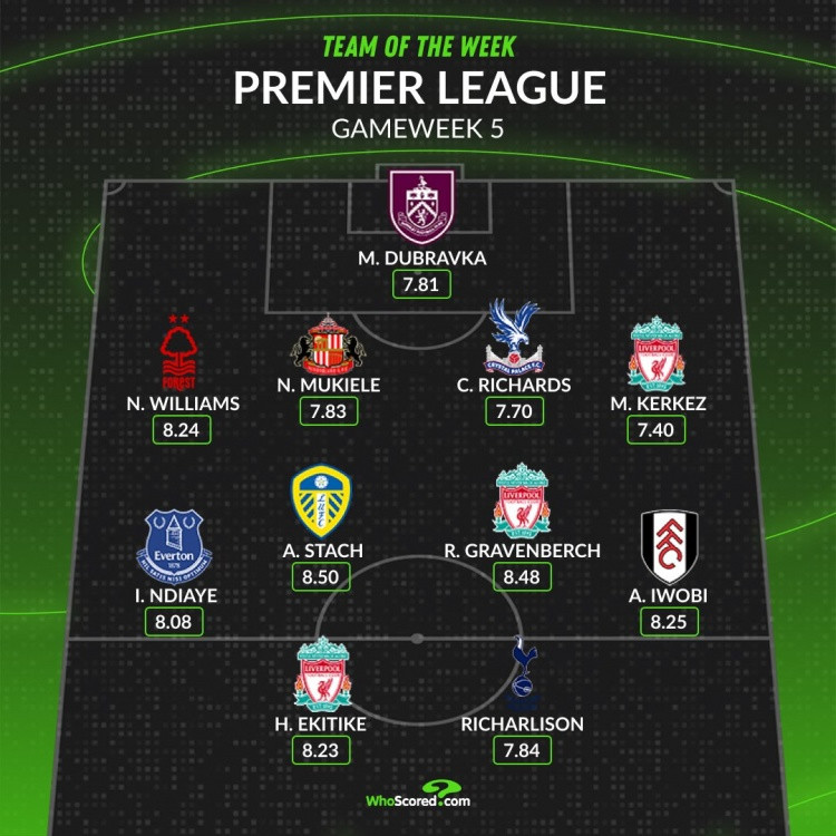 直播吧9月22日讯WhoScored评出了英超第5轮赛事 最佳阵形 ,理查利森、埃基蒂克在列,苏超直播利物浦3名球员入选。