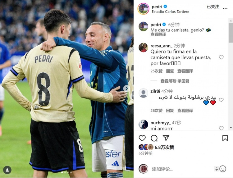 巴萨中场球员佩德里更新社媒动态即时投注手机app,晒出与皇家奥维耶多40岁中场球员卡索拉的赛后合照,苏超直播对其表达敬意,配文:“天才,能把你的运动活动 服 给我吗?”