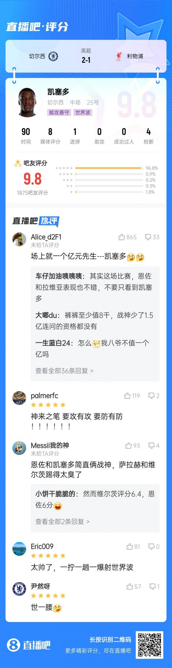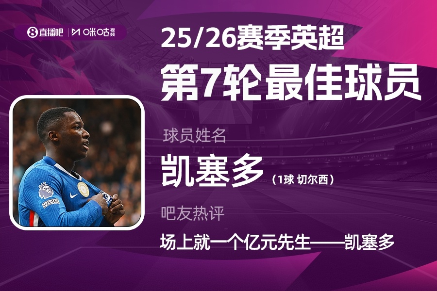 2025-2026赛季英超火热进行中,和咪咕体育联合发起每轮英超最佳球员评选活动!第7轮评选结果出炉,切尔西后腰凯塞多攻防兼备,苏超在线直播高清视频无插件轰入世界波帮助切尔西2-1战获胜 物浦,获得吧友5.6万票的支持,当选 【X咪咕体育英超第7轮最佳球员】!