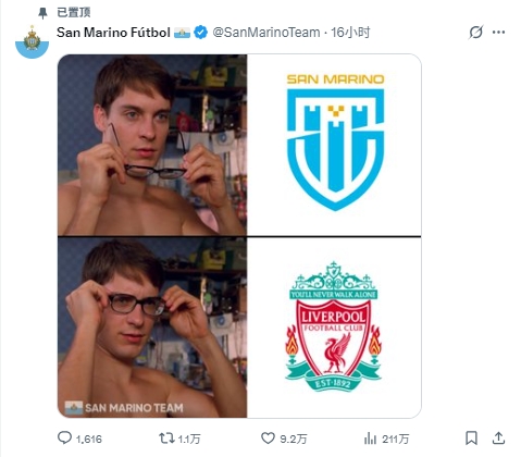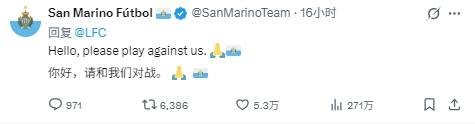 这引发了各界对利物浦的广泛批评。而FIFA目前排名倒数第一的圣马力诺也没有错过这波“天降的流量”,苏超直播在线观看他们在官方社媒上发布了一张调侃利物浦和自己实力相当的梗图,又在评论区@了利物浦的官方账号,说:“你好,请和我们来踢一场。”