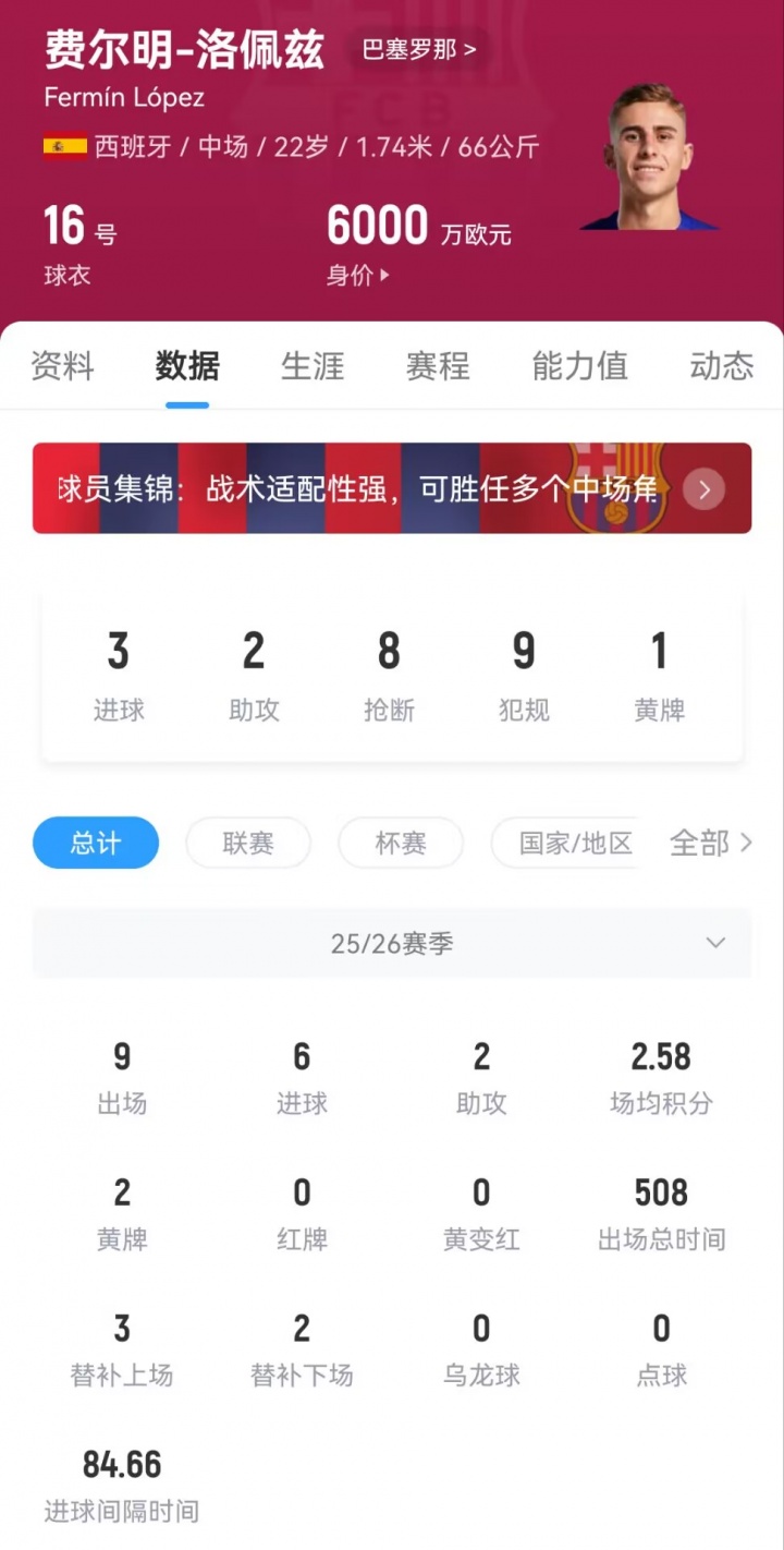 近3场赛事 中,费尔明为巴萨狂轰4球2助功 ,包括欧冠对奥林匹亚科斯的独中三元,以及国家德比中为巴萨打进的扳平得分 。新赛季,费尔明在各项赛事为巴萨出战9次,贡献6球2助功 。