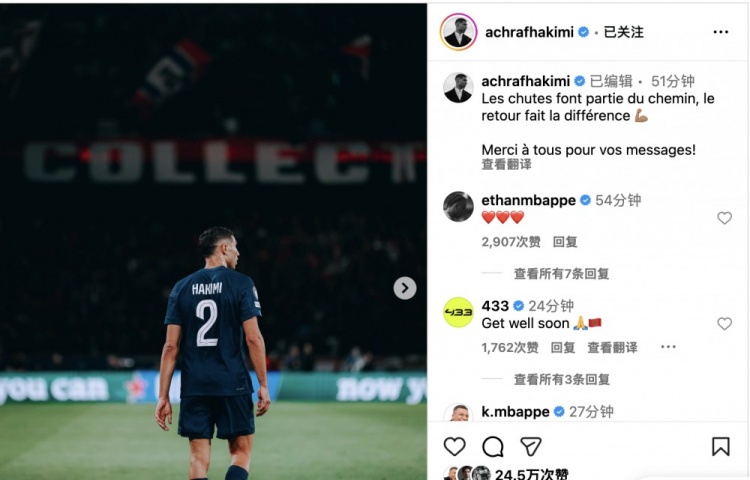 11月6日讯 阿什拉夫在对阵拜仁的赛事 中负伤 ,球员发文。
